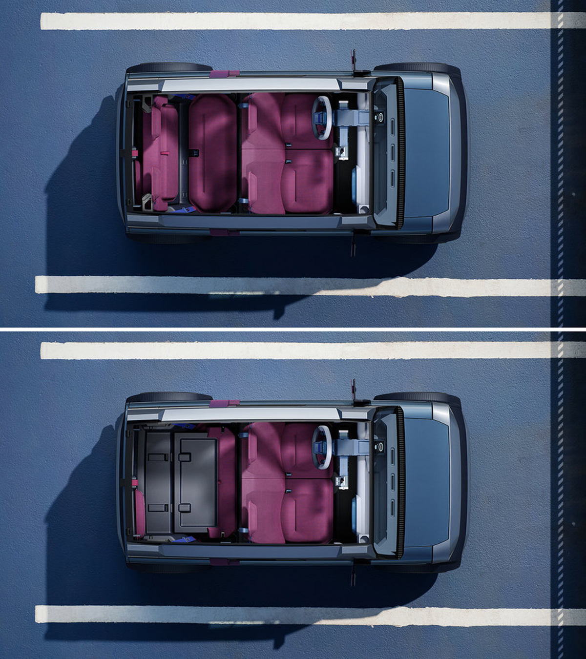 ülések kialakítására is, hogy a kényelmet és a felhasználóbarát jelleget ötvözze a súly- és költségcsökkentéssel. A kialakításukat leegyszerűsítették egy látható kerettel, amelyet egy különösen meleg technikai hálós anyaggal kombináltak. Az első ülések egy üléspaddá egyesültek, ami egy egyszerű és barátságos elem, és egy újabb utalás a múlt ikonikus népszerű autóira.